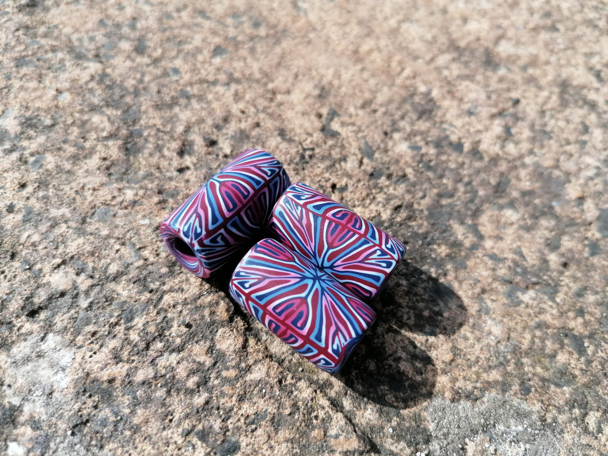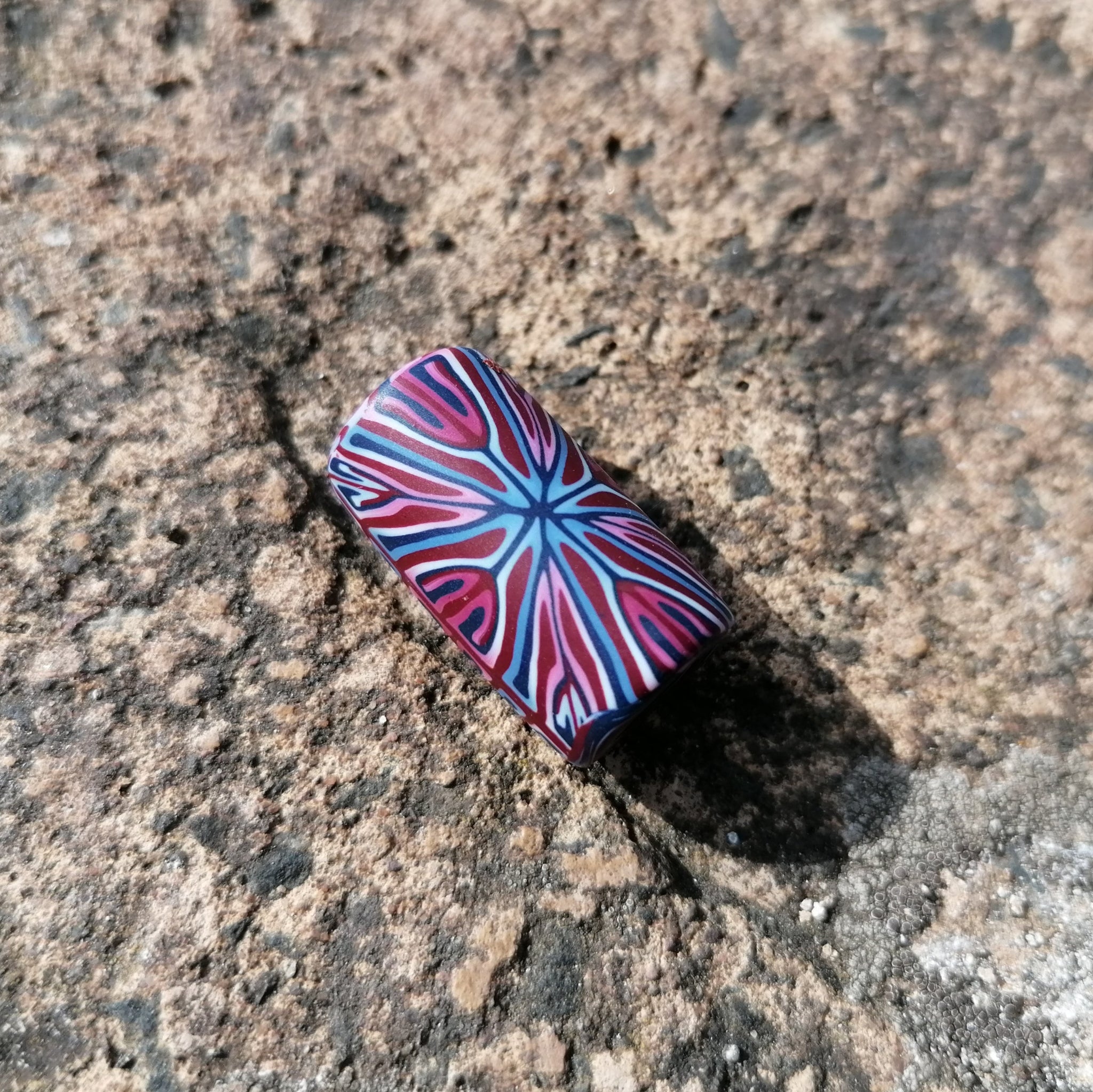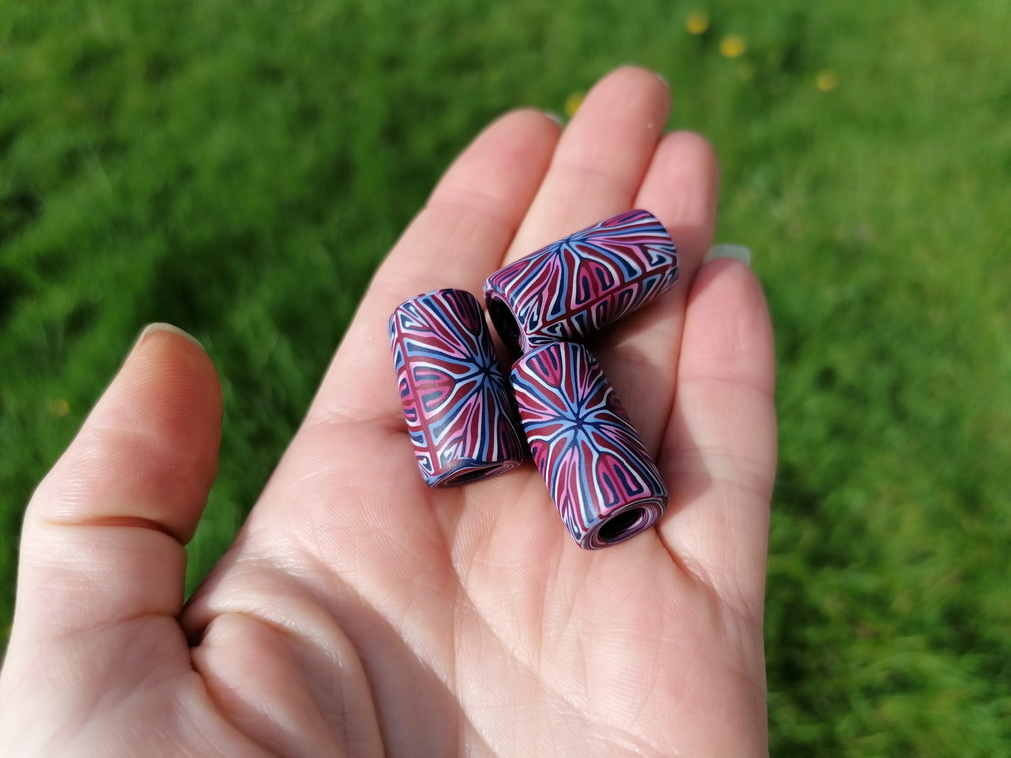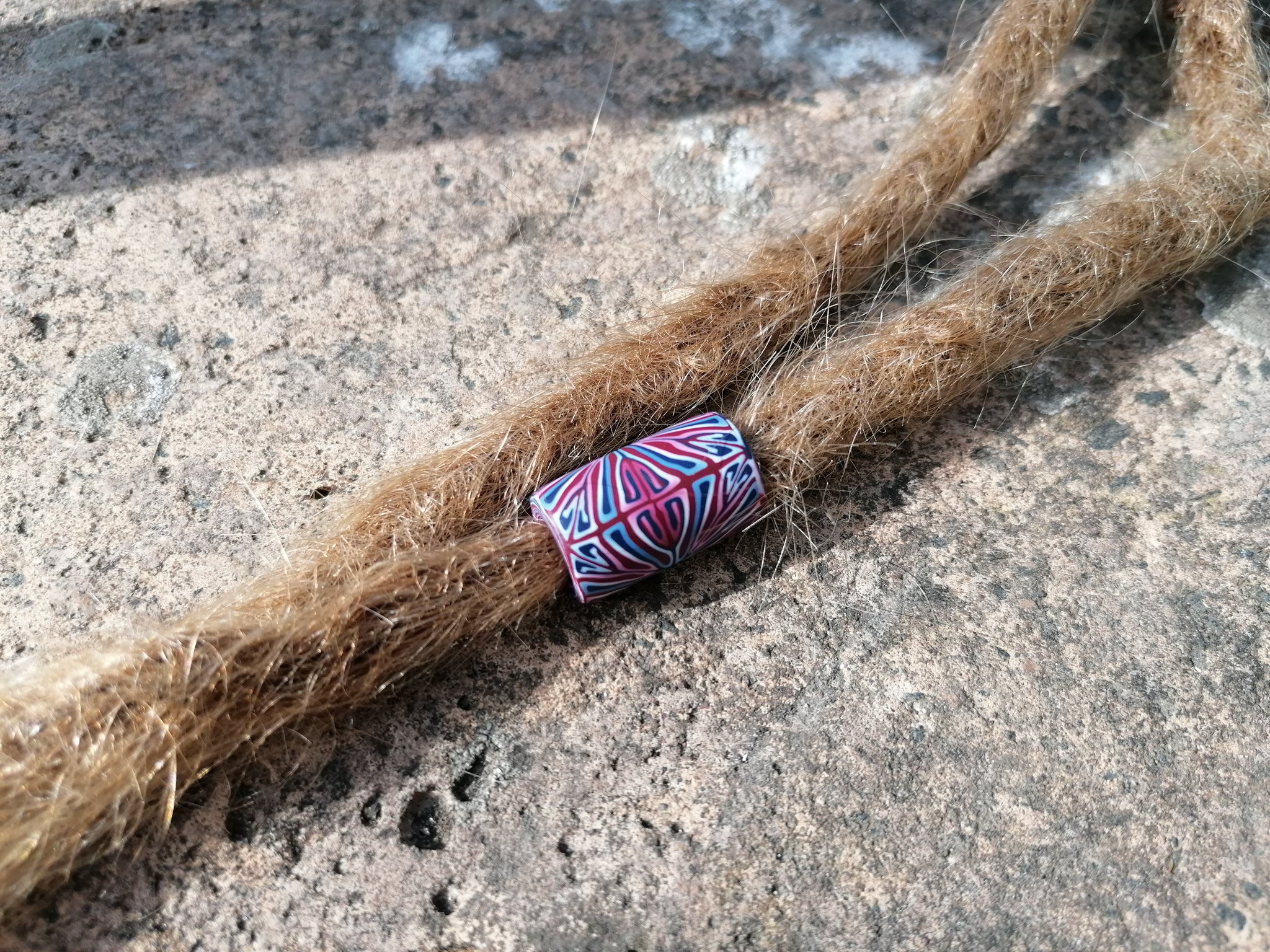 Handcrafted from high-quality polymer clay, this Burgundy, Blue & White Tile Cane Dread Bead brings a rich blend of colour and artistry to your dreads, braids, or locs. Each bead is created using a detailed tile cane technique, giving it its striking pattern and smooth, lightweight finish.